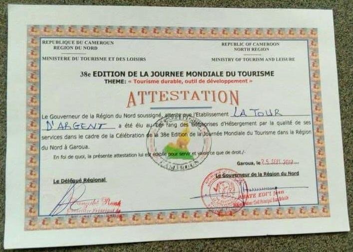 L’Hôtel La Tour d’Argent a reçu le prix de meilleure entreprise d’hébergement par la qualité de ses services dans le cadre de la célébration de la 38ème édition de la journée mondiale dans la région du Nord à Garoua. Ce prix est décerné par le Délégué régional du tourisme et le gouverneur de la région du Nord Cameroun.Les invités de l’hôtel ont salué l’excellence de l’accueil et le professionnalisme du personnel. La cuisine, dirigée par un chef renommé, a également été mise en avant pour la finesse et la diversité de ses plats, qui mettent en valeur les saveurs locales et internationales.